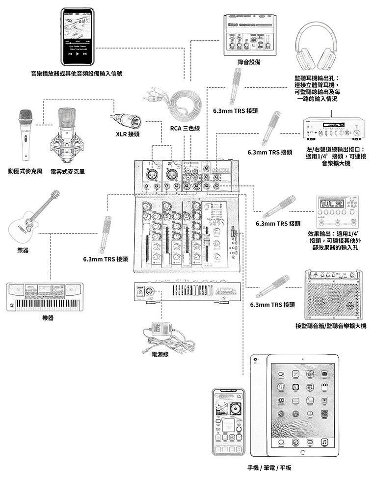 A:您好!請問您是詢問哪一款? 三款混音器接線方上如上方圖示,但若要匯入背景音樂需要配合其他軟體才能喔,謝謝!