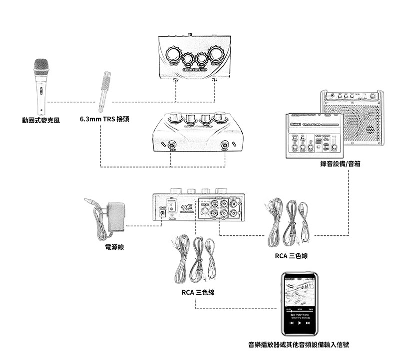 • 適用於教室、街頭藝人、家庭、KTV、擴大機前置輸入連接