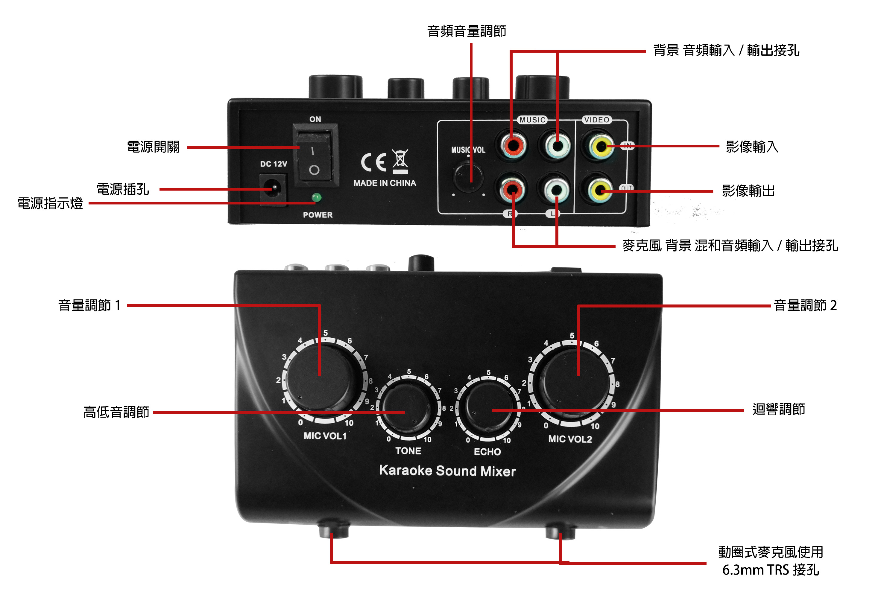 • 麥克風二路規格6.5輸入,二路麥克風音量獨立調節音量